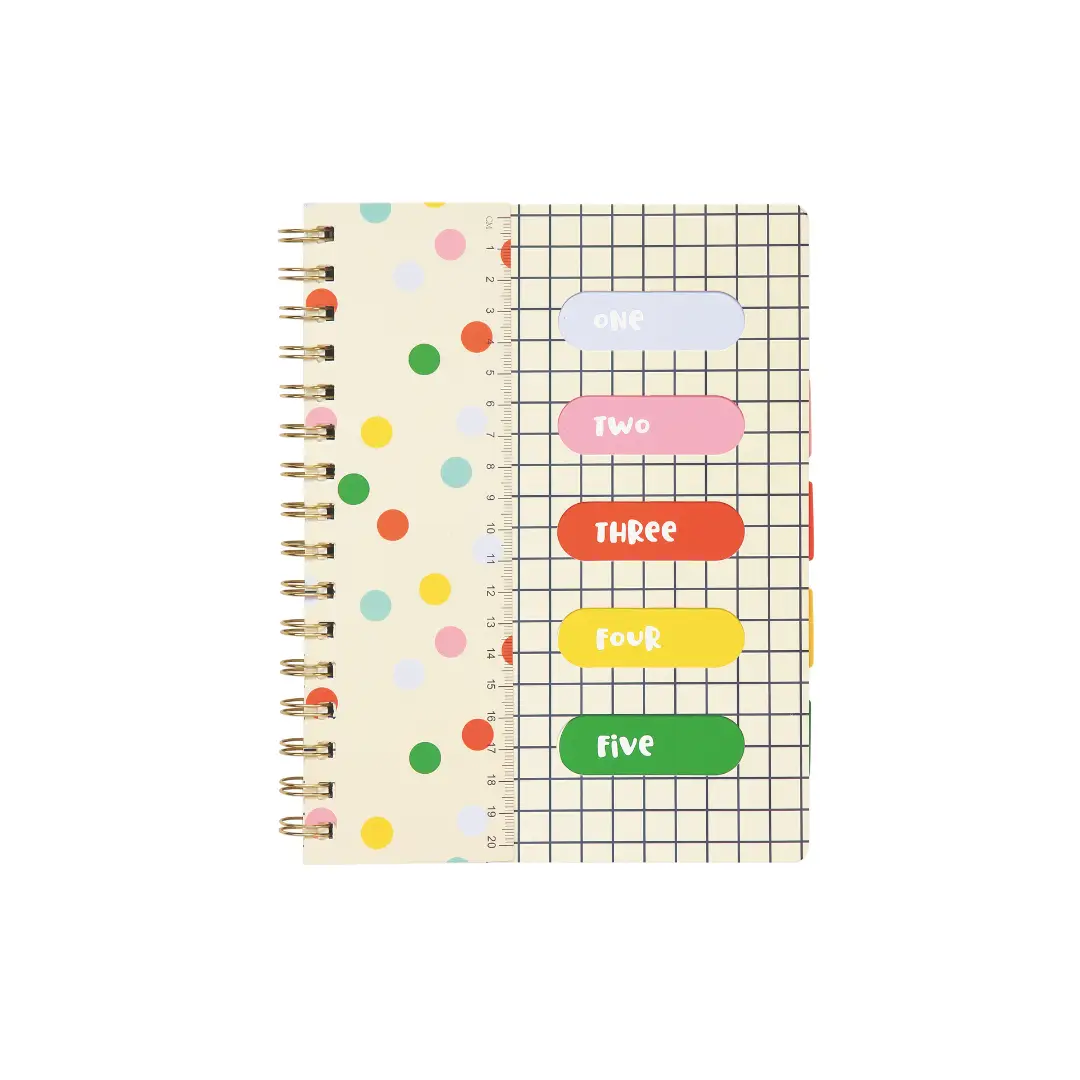 Caderno A5 com 96 folhas, capa soft plastificada e design moderno com divisórias coloridas numeradas (One a Five) para facilitar a organização. Ideal para uso escolar, universitário ou profissional. Compacto, leve e resistente, perfeito para anotações, estudos e planejamento diário.