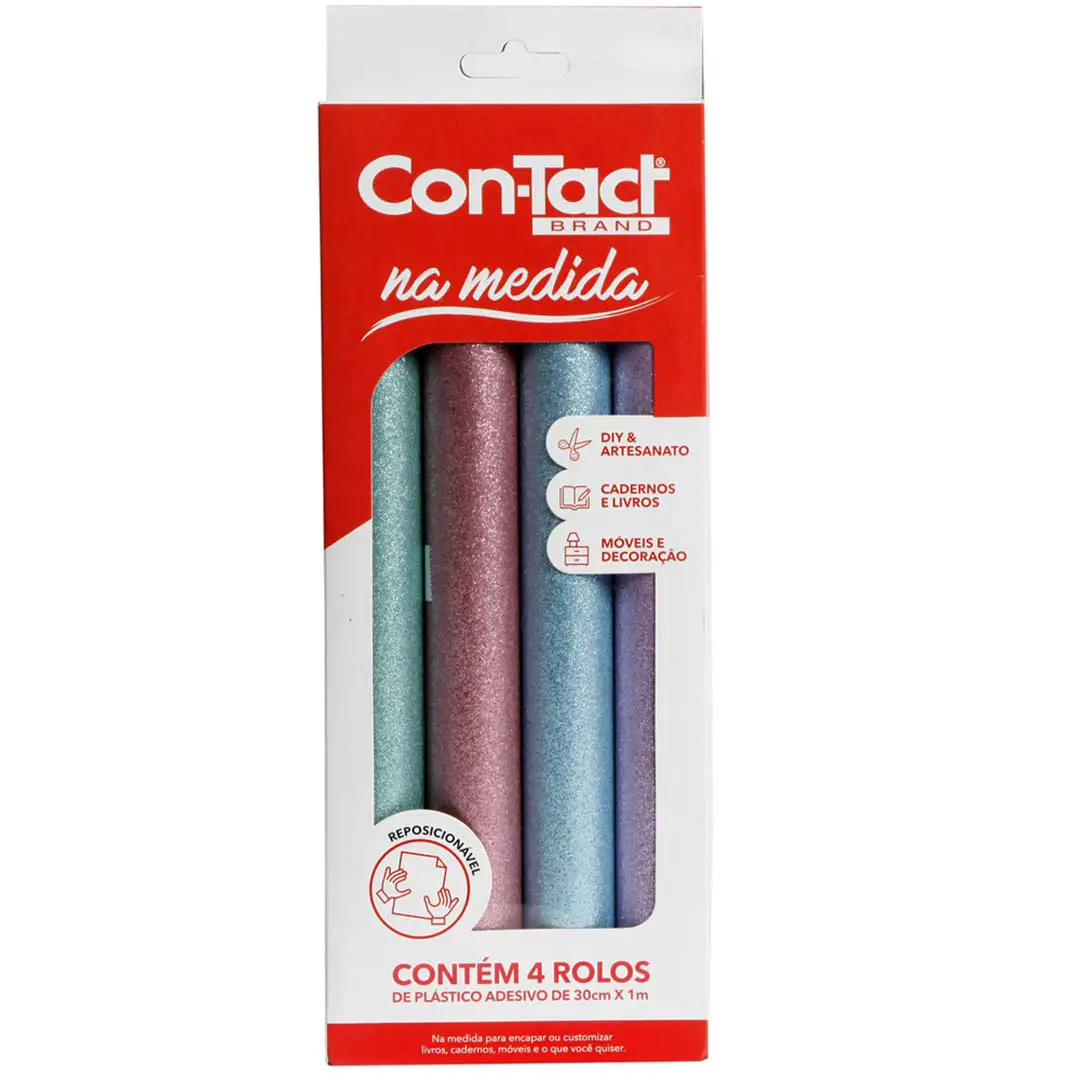Descrição do produto: Caixa com 4 rolos Na Medida de Glitter – Acabamento brilhante e decorativo, na medida para pequenos projetos, cadernos e livros. Autoadesivo, fácil de aplicar, resistente e com efeito cintilante que transforma qualquer objeto.
